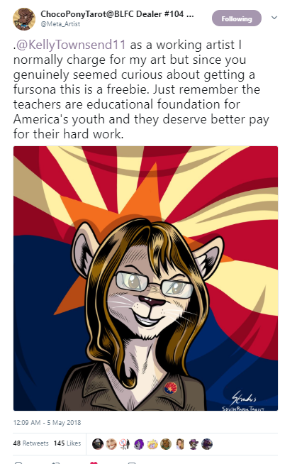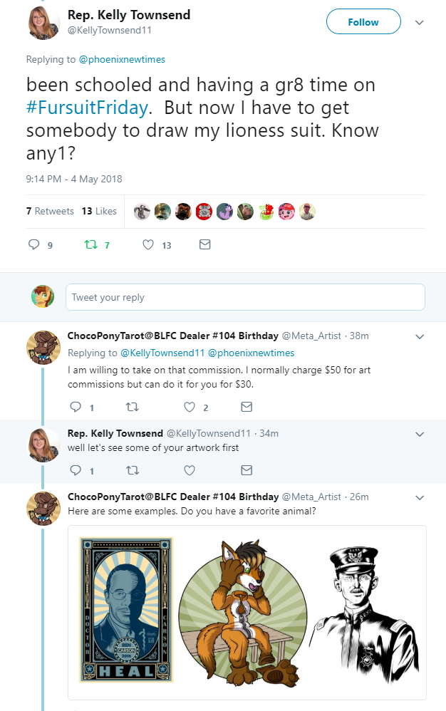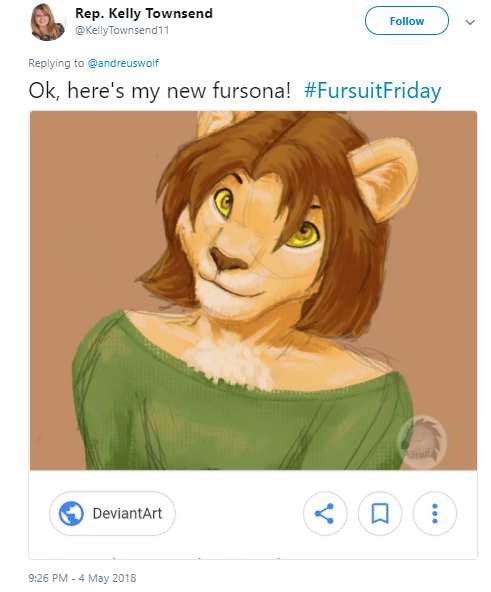 A Republican State Representative from Arizona may have set an internet record; going from total obliviousness to full blown furry in under 24 hours. Kelly Townsend, a Representative for Arizona’s 16th District since 2013 became entangled in a twitter debate regarding socialism and public education (Arizona public school teachers have been striking recently), when a twitter user named @andreuswolf called her out for getting “logically destroyed by a furry”.