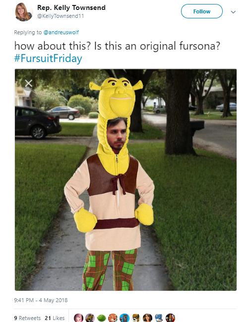 Eventually, after several hours of non-stop fur-posts, she seemed to understand the fetish world that she had just provoked, and instead of recoiling in terror (as one would expect an elected official to do), she seemed to embrace it (or, got a hip young social media person to take the reins). She asked for her own fursona (after making a shrekpost).